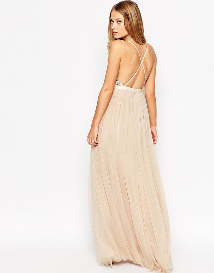 Maigi rozā, tilla izpušķotā maxi kleita ar kailo muguru ir visvairāk iegādātā šī gada izlaidumu kleita, saskaņā ar datiem no e-komercijas vietnes “Lyst”. Kleitas cena ir 300 ASV dolāri, un tā ir pārdota par 67 procentiem vairāk nekā citas kleitas, un ietver ņieburu, regulējamas siksnas un tilla pārklātus svārkus bēša krāsā. Stilu izpārdod dažādos izmēros, bet vietnē asos.com vēl ir pieejams 4.,8. un 10. izmērs.