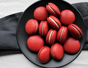 11) No konditorejas maisa vai ar karotīti uz viena cepuma uzsmērē nedaudz baltā pildījuma un tam virsū uzliek otru makarūna pusīti.