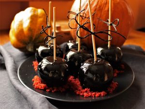 2) Gatavo melno karameli – katlā ar biezu pamatni ieber cukuru, ūdeni, sāli, sviestu, melno krāsvielu un sīrupu. Uzvāra un tad vāra vēl ~12 min, līdz karamele sabiezē (ja ir konditorejas termometrs, tad tam ir jārada 145°C). Iegūto karameli noņem no plīts ātri apmērcē tajā visus ābolus, katrā iedurot kociņu, uz kura ābols turēsies. Karamelei ābols jāpārklāj no visām pusēm Pēc tam ābolus liek uz cepampapīra un ļauj karamelei sastingt.