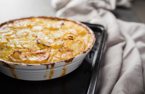 Karsē cepeškrāsni līdz 160 – 170 grādiem. Pa to laiku kartupeļus kārto cepešpannā. Formai nav nozīmes, taču atceries, jo vairāk kārtas būs sacepumam, jo ilgāk tas gatavosies. Pa virsu liec cepamparīru, kas izgriezts tieši tādā pašā formā kā cepamforma. Cep no 1 h līdz gatavībai, atkarībā, kādu formu izmanto. Vislabāk sacepums garšos, ja pēc cepšanas to uzliksi uz sloga, lai atdziestot kārtas saliptu un veidotu saturīgu sacepumu.