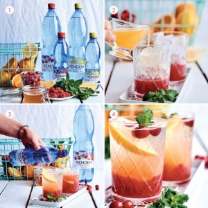 7. Atlikušajā glāzes daļā piepilda VENDEN gāzētu ūdeni ar dzērveņu aromātu.