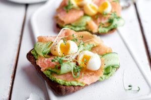 Pilngraudu maizītes ar lasi, avokado un olu