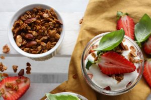 Zemeņu – biezpiena kārtojums ar grauzdētu auzu pārslu našķi jeb granolu